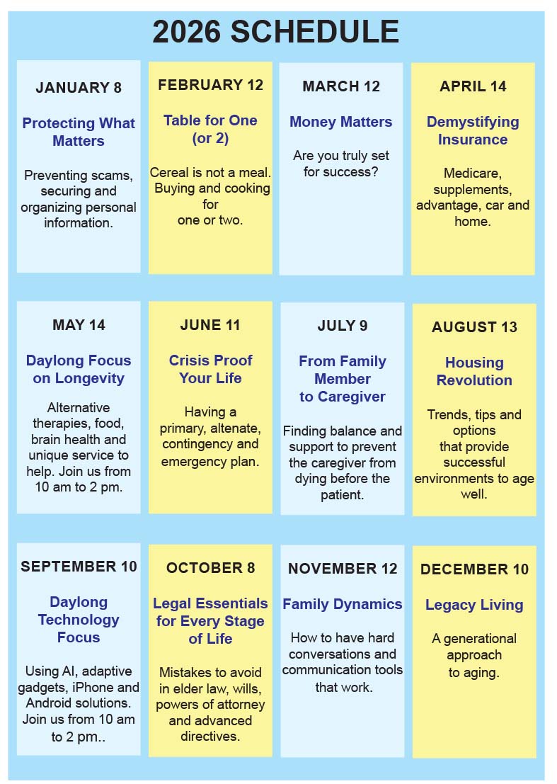 “These seminars are about giving people practical tools they can use right now, while also helping them think proactively about the future,” said Julie Davis, moderator of the Positive Aging series. “We’re seeing strong interest because the topics speak directly to real-life concerns — from finances and housing to wellness, caregiving, technology and legacy planning.”